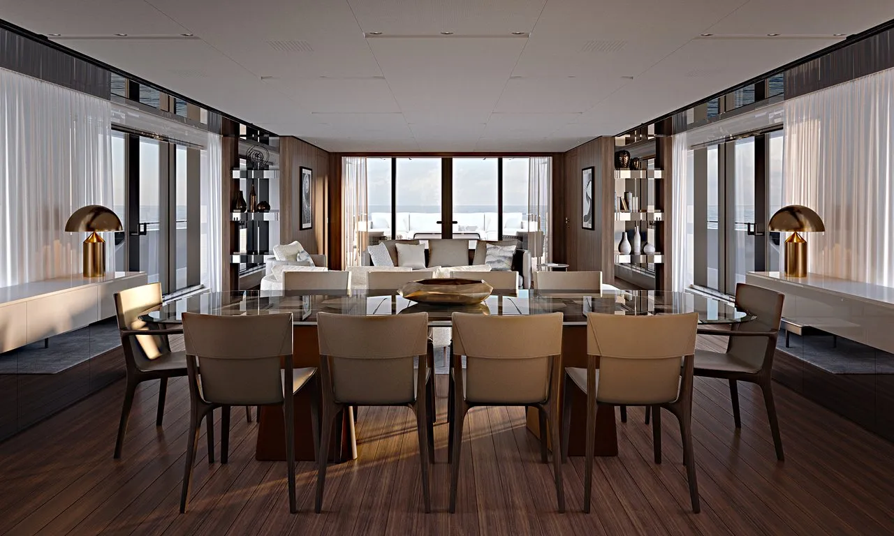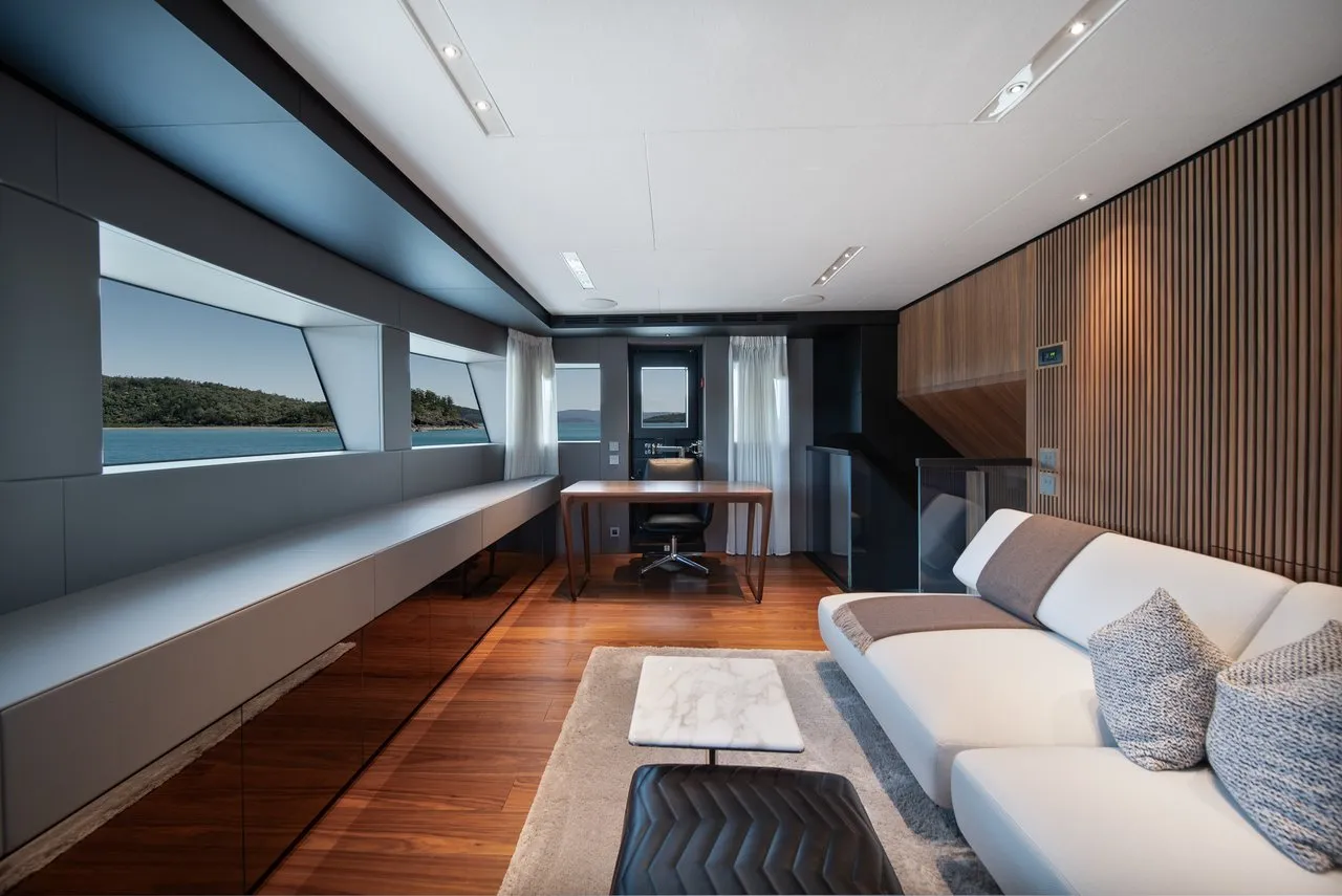Accommodating 10 guests over 5 cabins, and 12 guests on application, AIX offers innovation rarely seen on a yacht of her size. The project's highlight is the owner's cabin, designed as a private apartment of 147 square meters, organised on three levels with indoor and outdoor areas offering direct access to her foredeck pool.