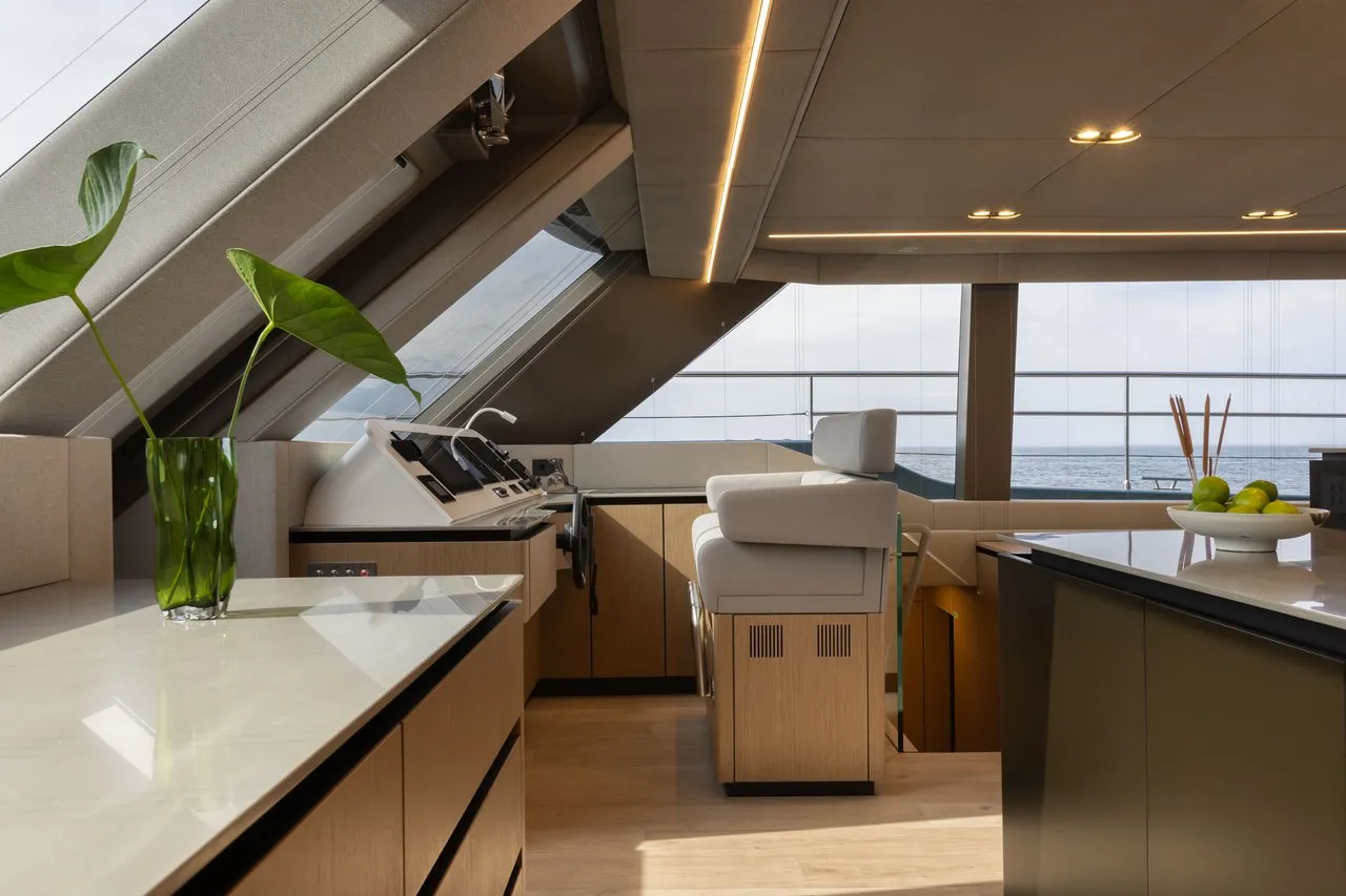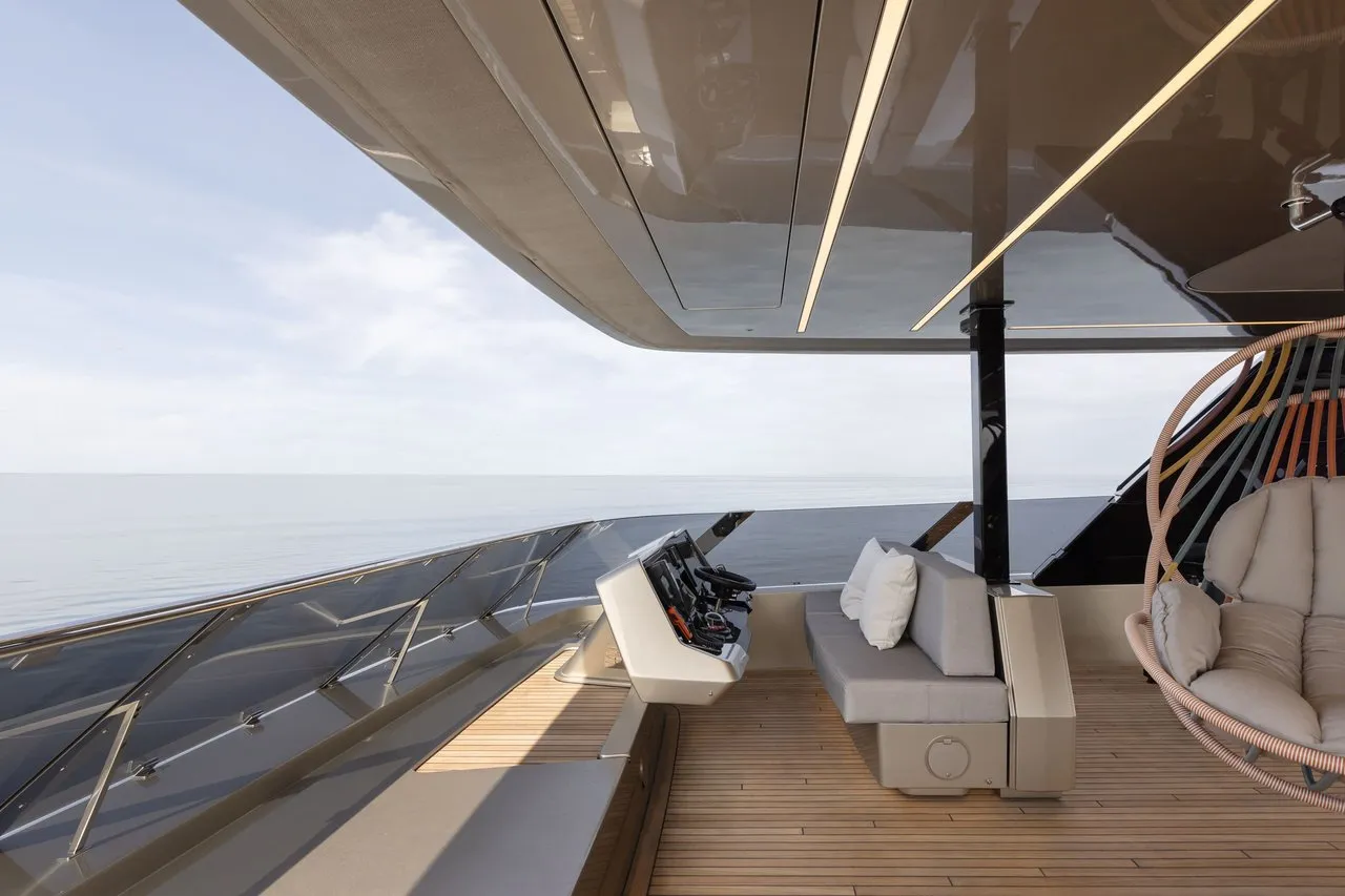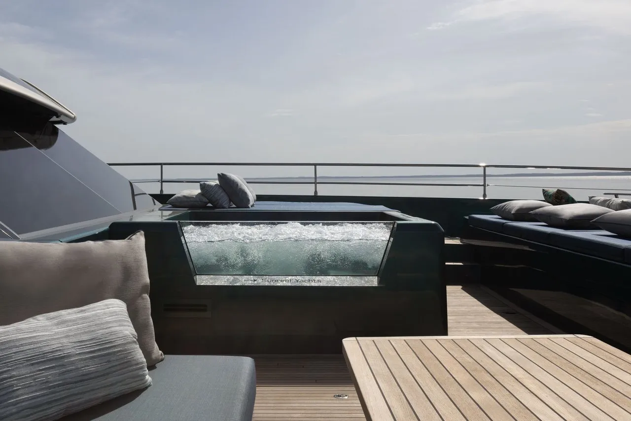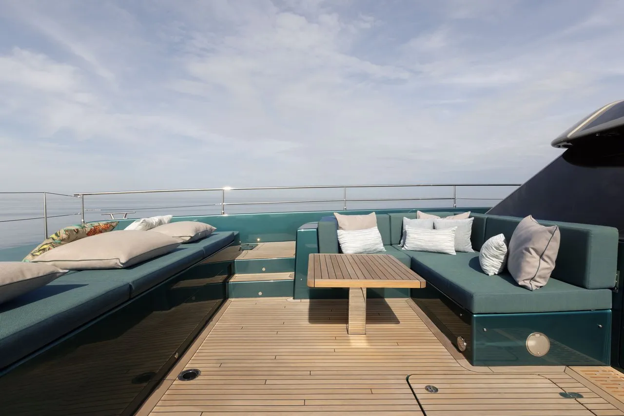 The aft cockpit flows seamlessly into the luminous saloon, which opens fully to the exterior and offers sweeping views and natural light. A discreet garage holds an array of water toys, while the hydraulic swim platform can be transformed into a private beach club. The forward terrace completes the outdoor experience with its generous sunpads and a jacuzzi, perfect for unwinding in total privacy.