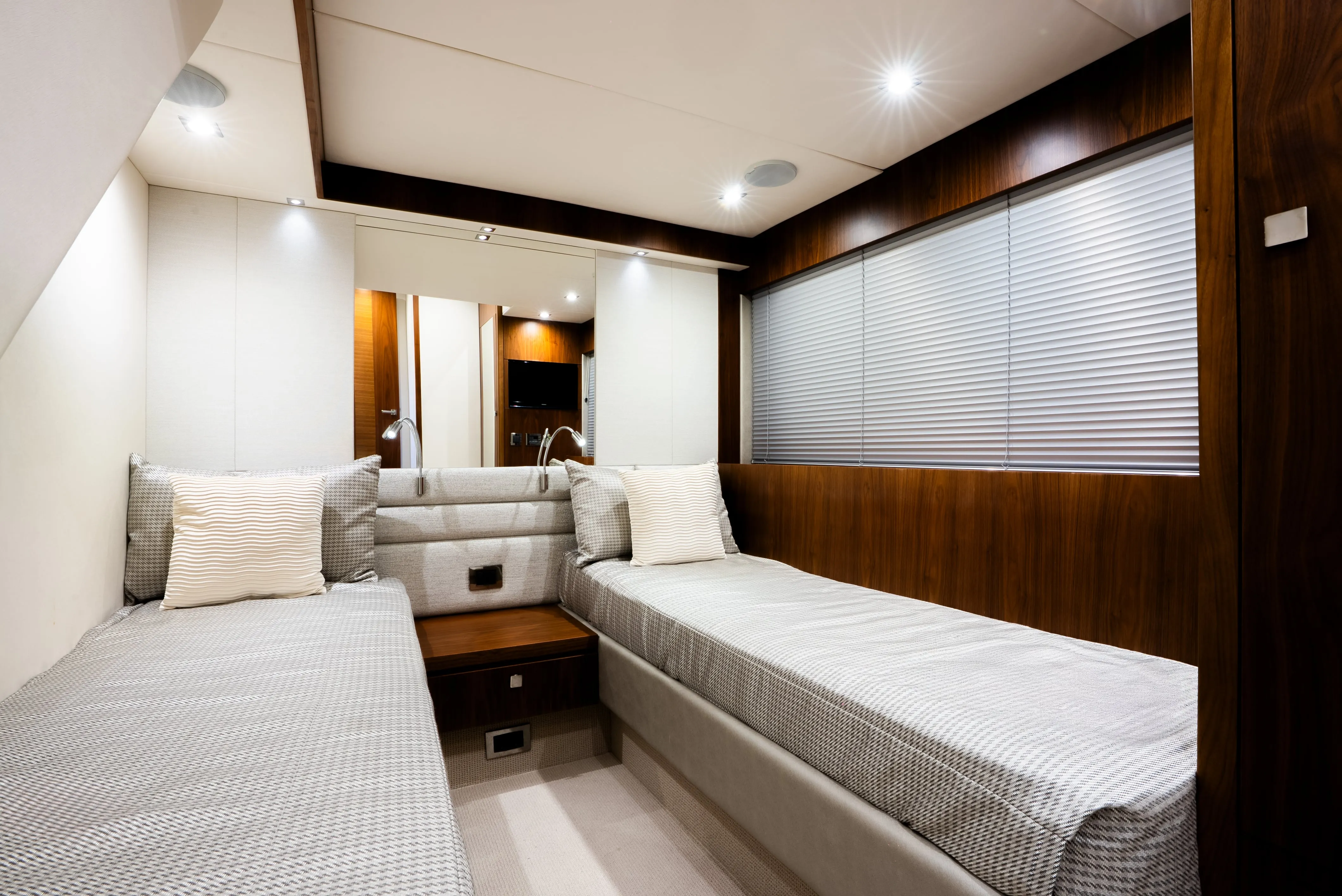 El Ultimo has a large open-plan well-equipped galley as you walk in, which continues into a large saloon and dining area. The main helm is also based on this deck with adjacent seating. The Sunseeker Manhattan 66 offers spacious and versatile accommodations with four beautifully appointed cabins, three modern bathrooms, and a dedicated crew cabin. The owner’s cabin is designed for privacy, thoughtfully separated from the other cabins, ensuring tranquillity and comfort.