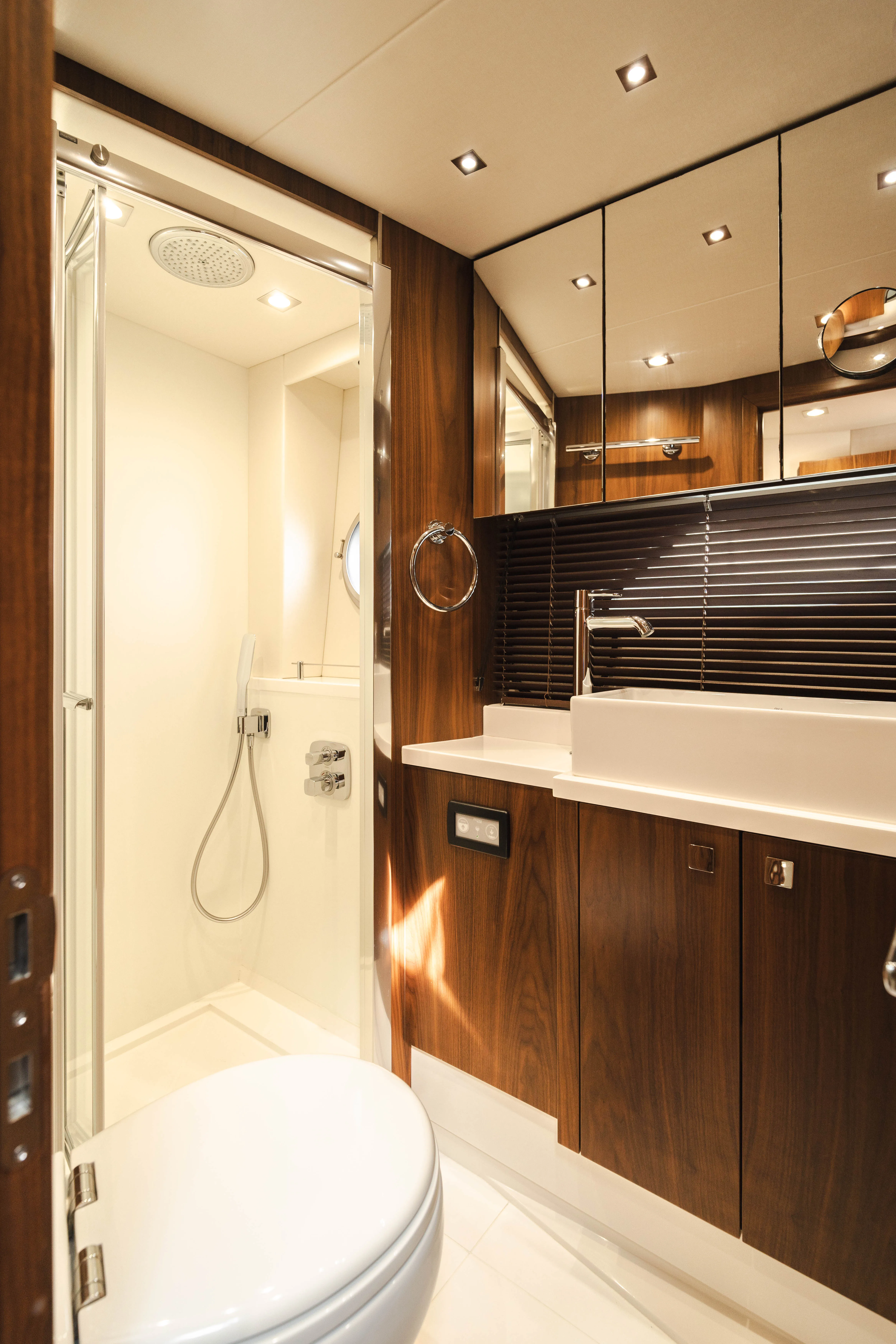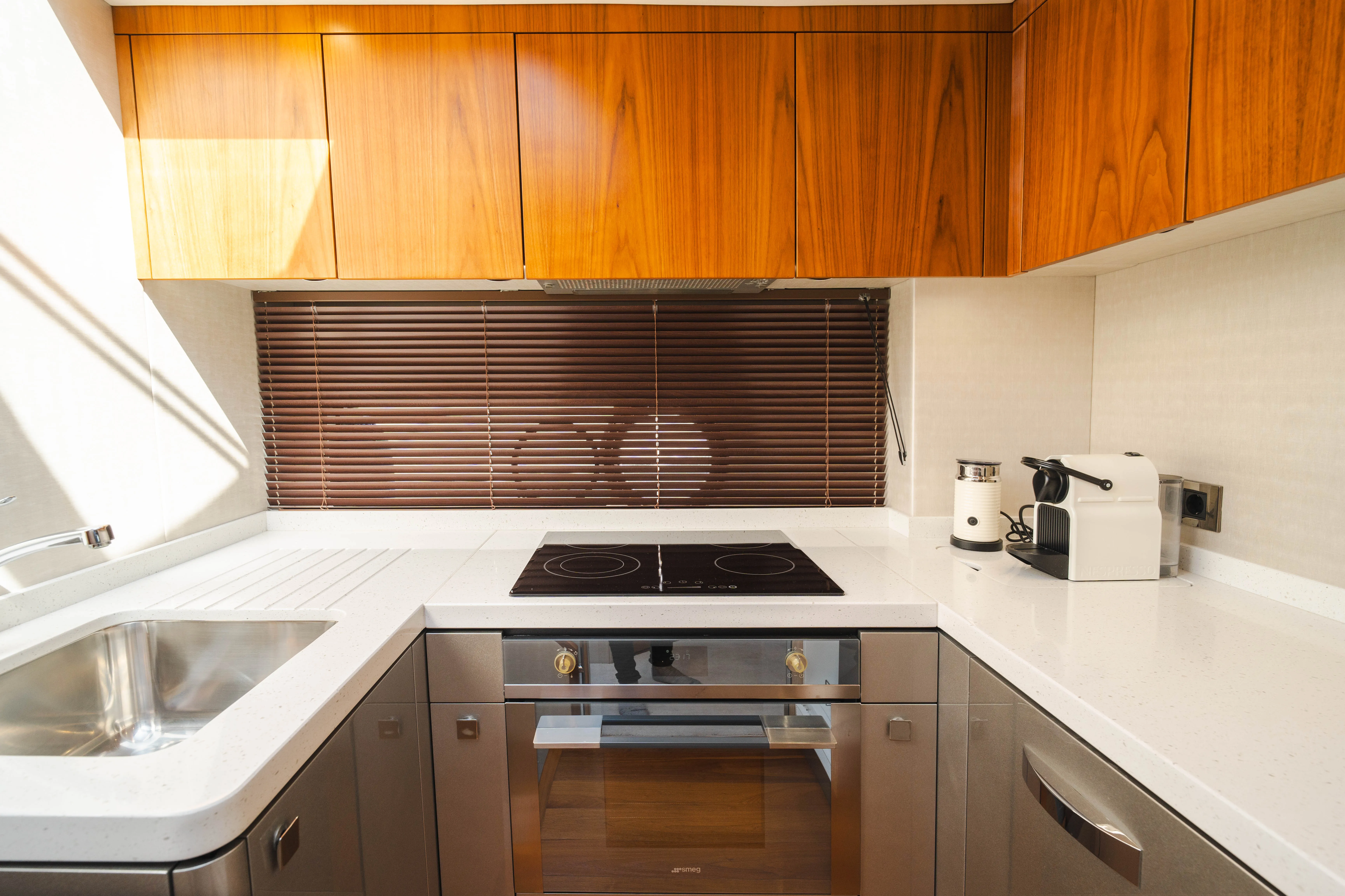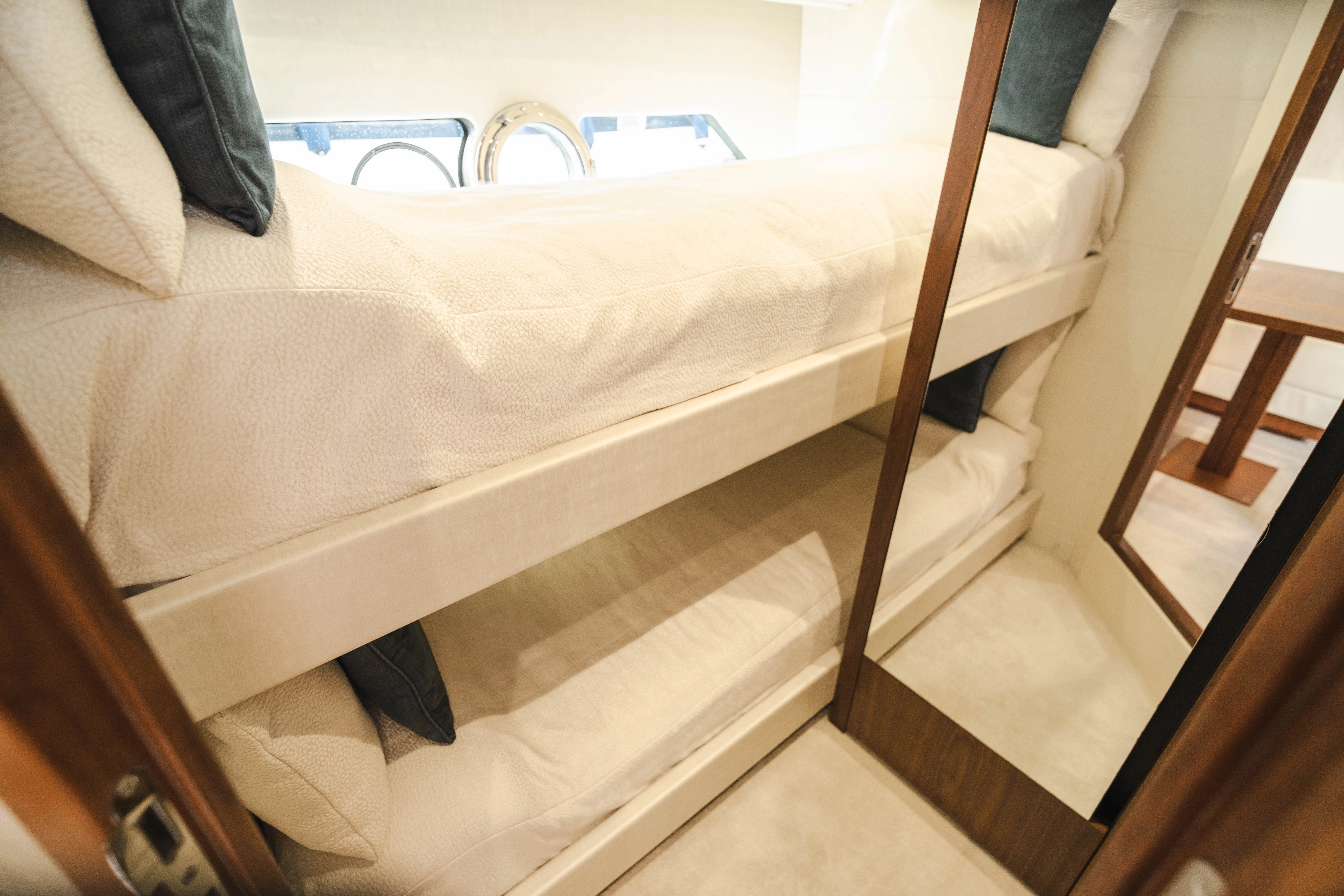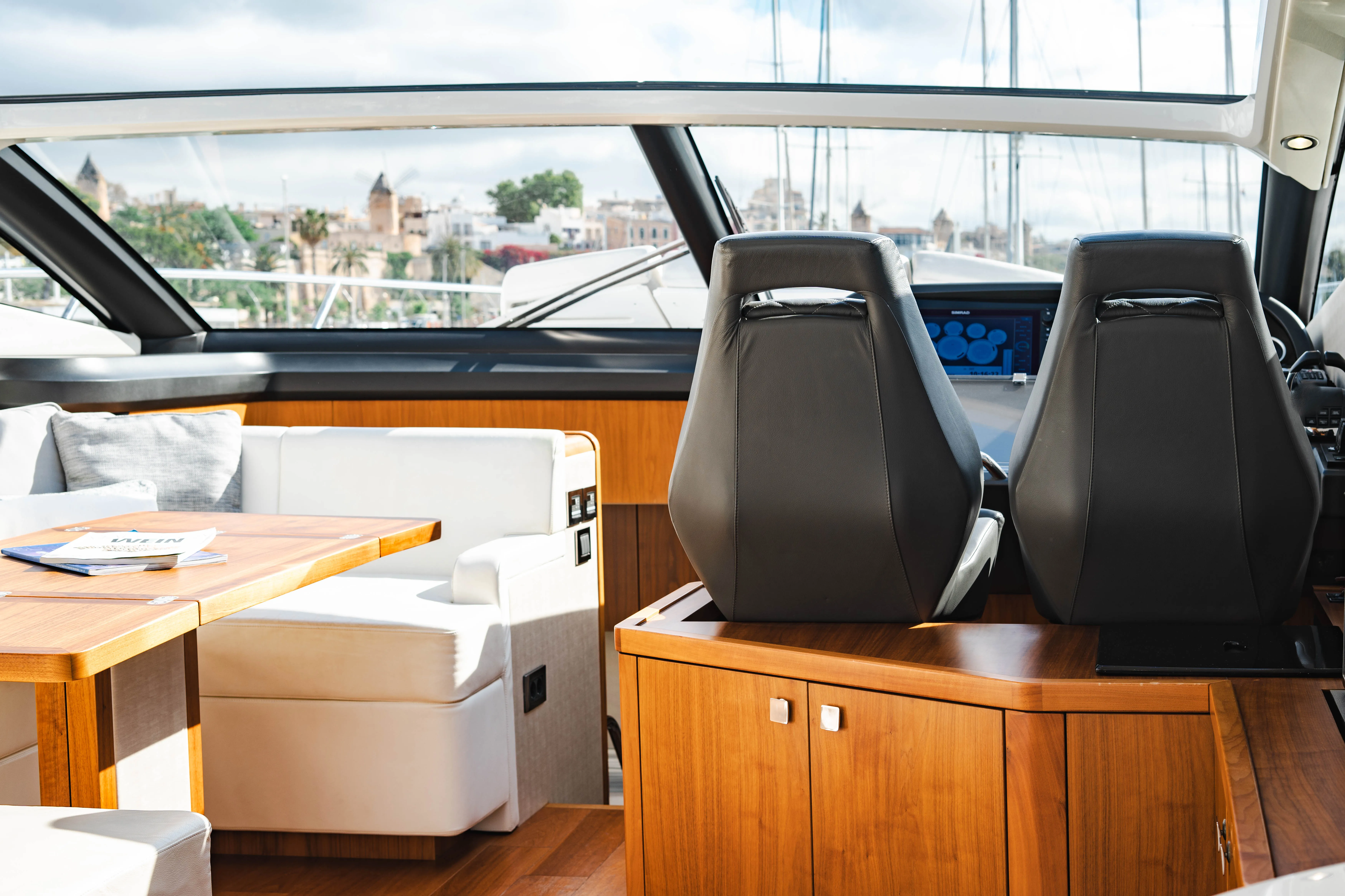 Inside, a light-filled saloon blends with the cockpit thanks to the retractable doors and open hardtop. Below deck, three stylish cabins sleep six guests comfortably, including a spacious full-beam master suite. The fully equipped galley and entertainment systems ensure comfort on every journey.