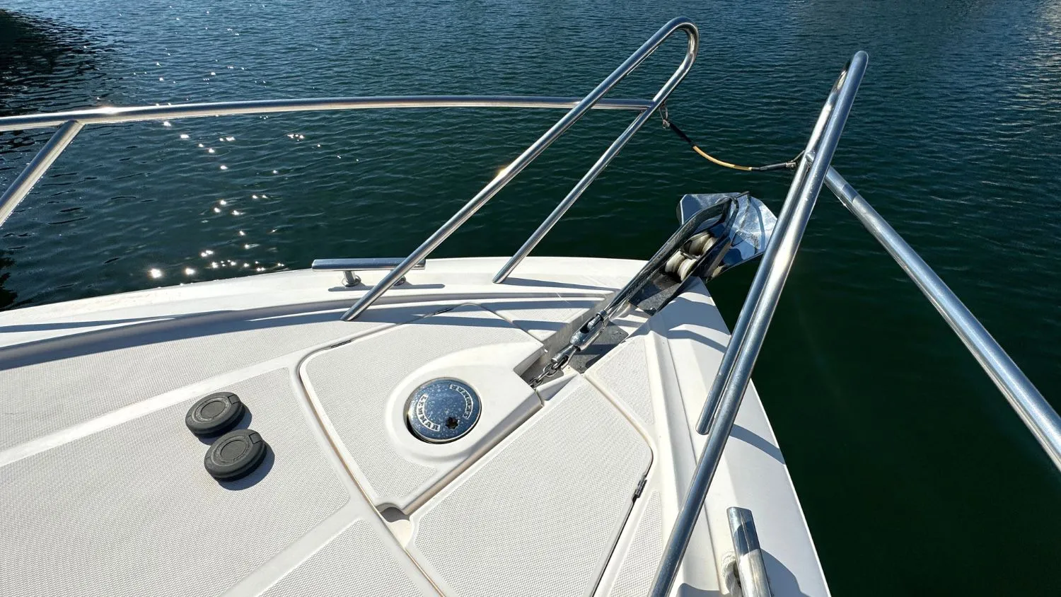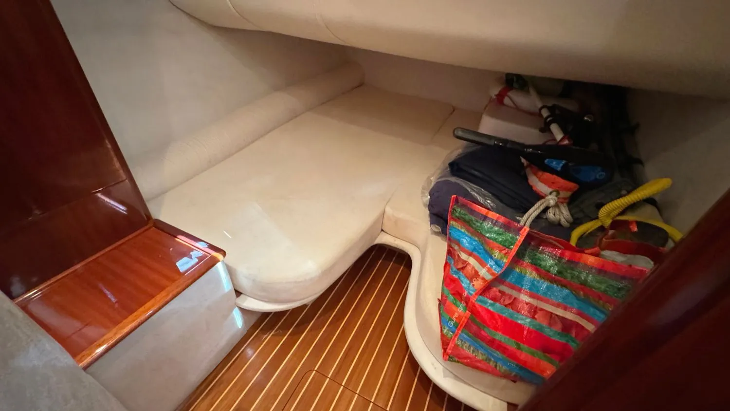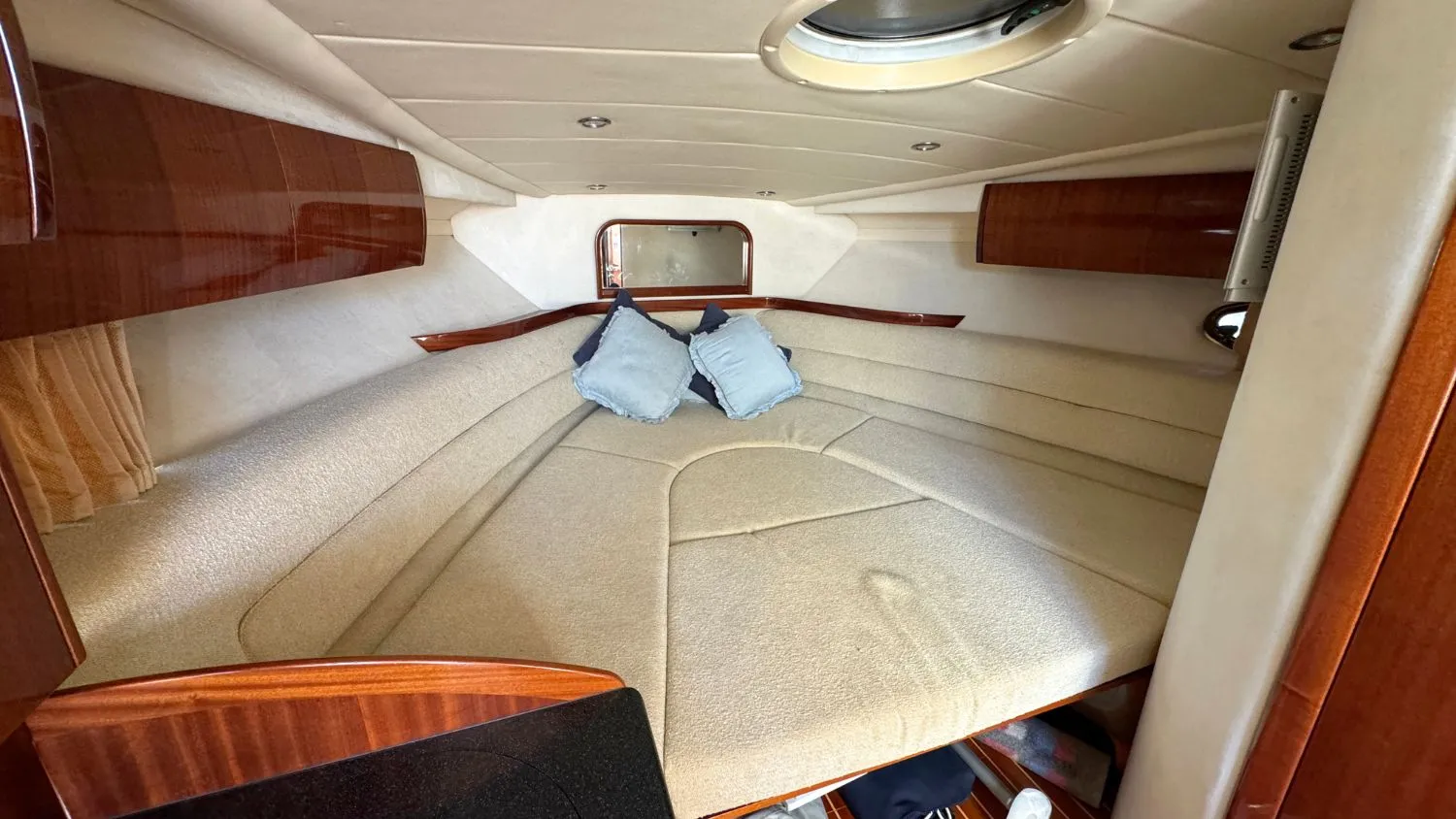 Her interior consists of a small utility area fitted with a microwave and sink, a bow berth for two and a second cosy berth area for up to another two people. The berths are probably most suitable for a young family or two adults.